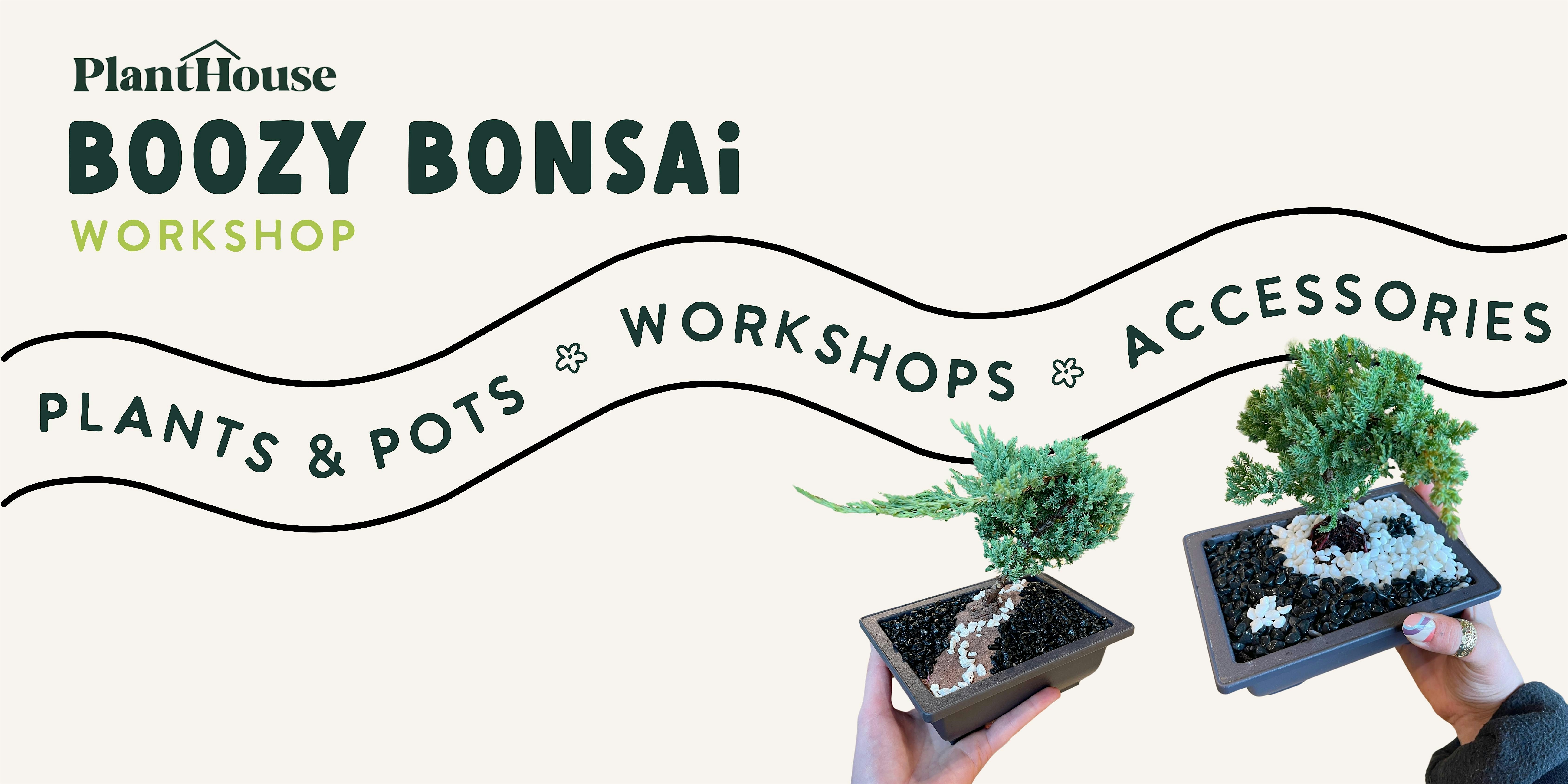 Indulge your senses and cultivate your creativity at our Boozy Bonsai Workshop! Join us for an evening of bonsai planting and delightful libations as you select your very own bonsai tree to plant into a vessel. Under the expert guidance of the PlantHouse crew, you'll learn the art of bonsai planting, including rock soil and planting techniques, as well as valuable care tips to help your bonsai thrive.