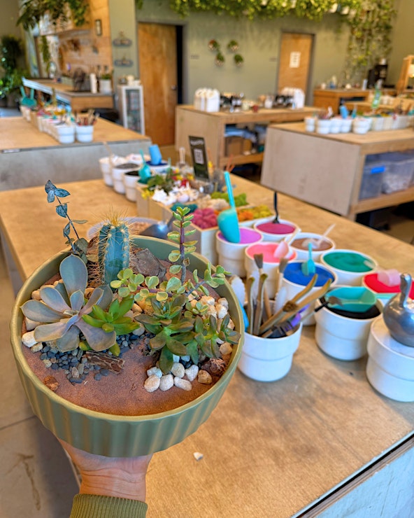 You’ll choose from a curated selection of cacti and succulents to plant in your choice of two unique dish styles: the modern Green Beam Bowl or the textured Terrazzo Bowl. Our crew will guide you through each step, from layering soil to arranging your plants and adding decorative elements like rocks, sand, and moss.