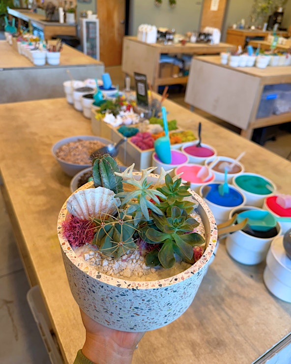 You’ll choose from a curated selection of cacti and succulents to plant in your choice of two unique dish styles: the modern Green Beam Bowl or the textured Terrazzo Bowl. Our crew will guide you through each step, from layering soil to arranging your plants and adding decorative elements like rocks, sand, and moss.
