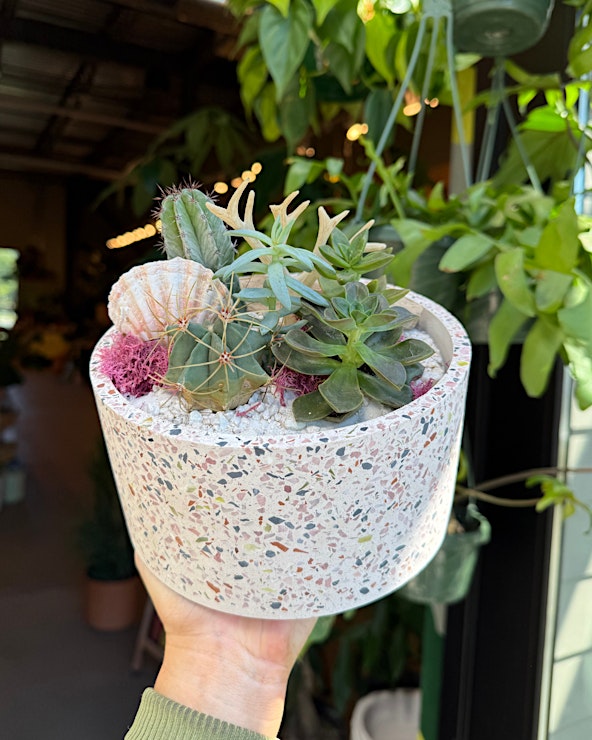 You’ll choose from a curated selection of cacti and succulents to plant in your choice of two unique dish styles: the modern Green Beam Bowl or the textured Terrazzo Bowl. Our crew will guide you through each step, from layering soil to arranging your plants and adding decorative elements like rocks, sand, and moss.