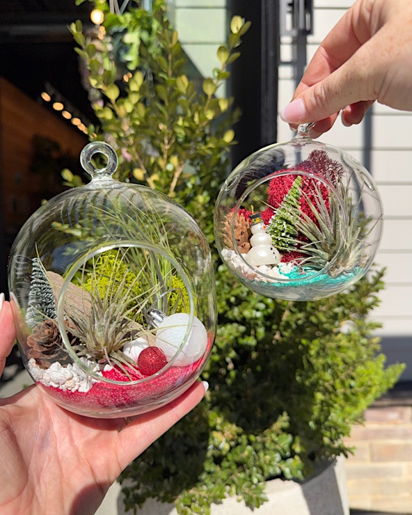 Join us this December at PlantHouse for a merry and bright experience at our Holiday Ornament Set Workshop. In this hands-on session, you’ll design two beautiful air plant terrariums: a 6" hanging oval and a 4" hanging round.