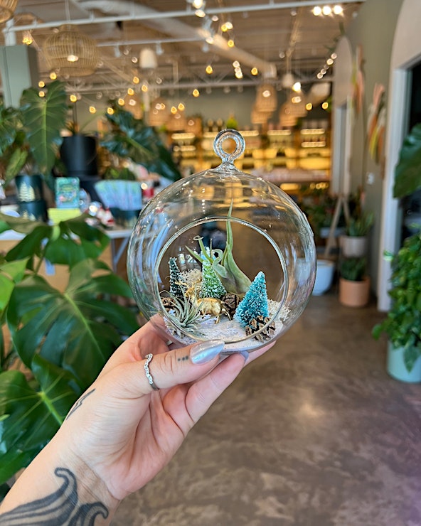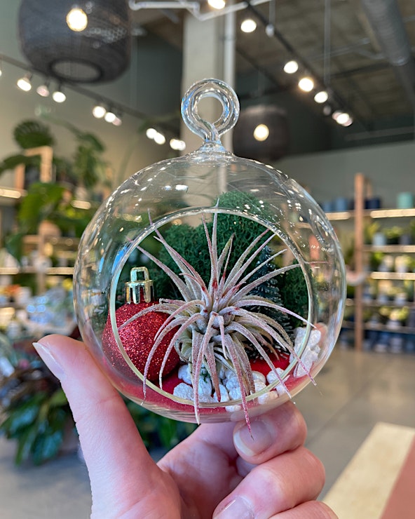 Join us this December at PlantHouse for a merry and bright experience at our Holiday Ornament Set Workshop. In this hands-on session, you’ll design two beautiful air plant terrariums: a 6" hanging oval and a 4" hanging round.